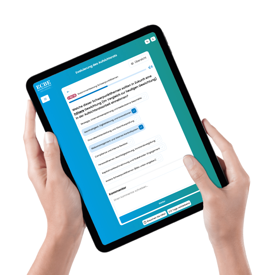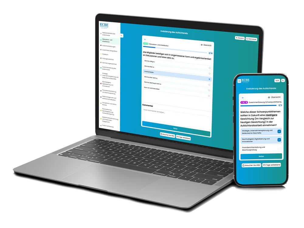 Grundlage unseres innovativen Evaluierungsprozesses ist die Beantwortung eines digitalen - bei Bedarf mehrsprachigen - Fragebogens mit dem ECBE-Tool. Durch individuelle Zugangslinks kann der jeweiligen Rolle und Funktion der Gremienmitglieder Rechnung getragen werden. Die benutzerfreundliche Anwendung ermöglicht die Nutzung beliebiger Endgeräte. Unsere DSGVO-konforme Technologie erfüllt höchste Sicherheitsstandards und garantiert die vollständige Anonymität bei der Beantwortung.